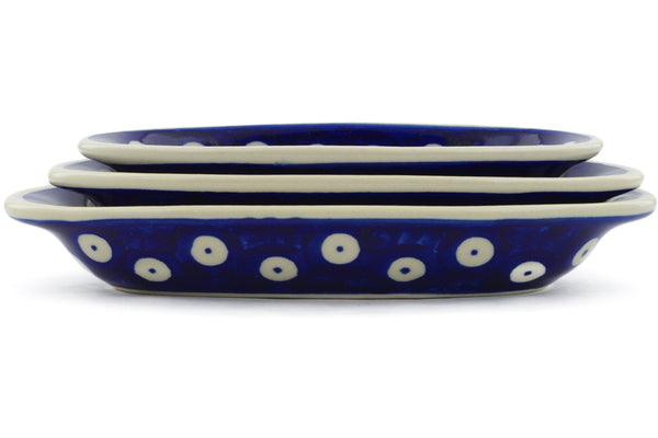 This Blue Eyed Peacock Condiment set of 3 nesting dishes: 7¼-inch, 6½-inch, 5¾-inch was handmade and hand decorated in Boleslawiec, Poland by skilled artisans according to old traditional methods. This Polish stoneware is microwave, dishwasher, freezer, and oven safe up to 480°F. It does not contain lead or cadmium. It is part of the Blue Eyed Peacock Collection.