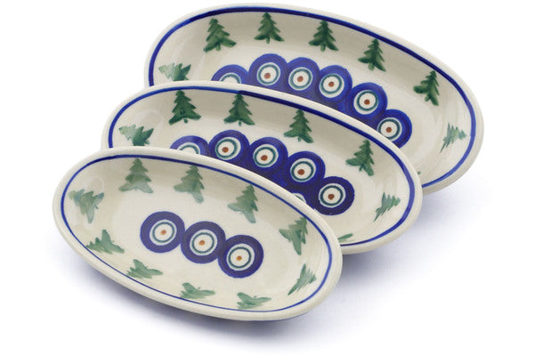 This Peacock Pines Condiment set of 3 nesting dishes: 7¼-inch, 6½-inch, 5¾-inch was handmade and hand decorated in Boleslawiec, Poland by skilled artisans according to old traditional methods. This Polish stoneware is microwave, dishwasher, freezer, and oven safe up to 480°F. It does not contain lead or cadmium. It is part of the Peacock Pines Collection.