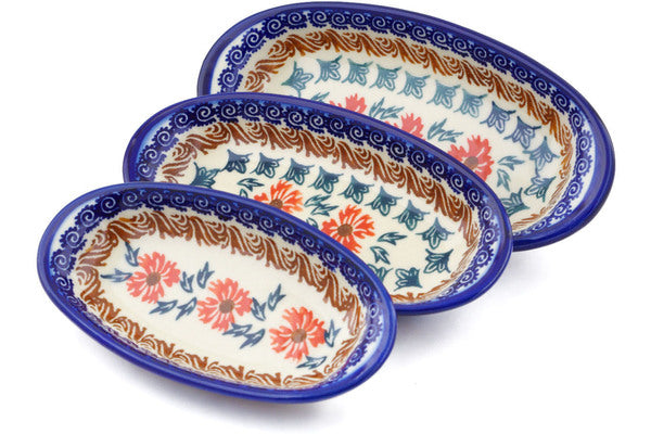 This Red Cornflower Condiment set of 3 nesting dishes: 7¼-inch, 6½-inch, 5¾-inch was handmade and hand decorated in Boleslawiec, Poland by skilled artisans according to old traditional methods. This Polish stoneware is microwave, dishwasher, freezer, and oven safe up to 480°F. It does not contain lead or cadmium. It is part of the Red Cornflower Collection.