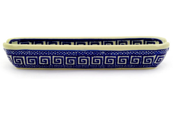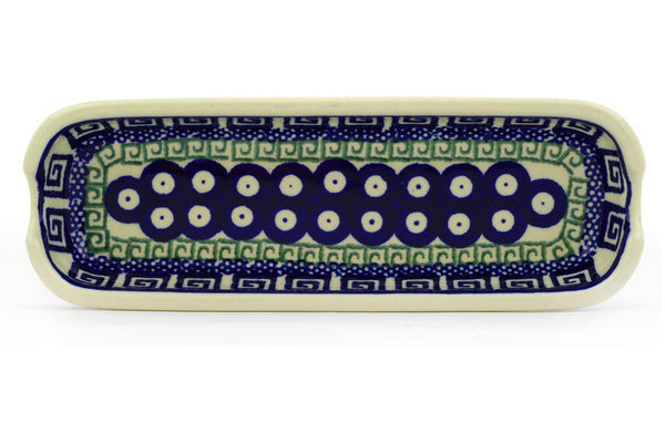 This Grecian Peacock 9" Corn Tray was handmade and hand decorated in Boleslawiec, Poland by skilled artisans according to old traditional methods. This Polish stoneware is microwave, dishwasher, freezer, and oven safe up to 480°F. It does not contain lead or cadmium. It is part of the Grecian Peacock Collection.