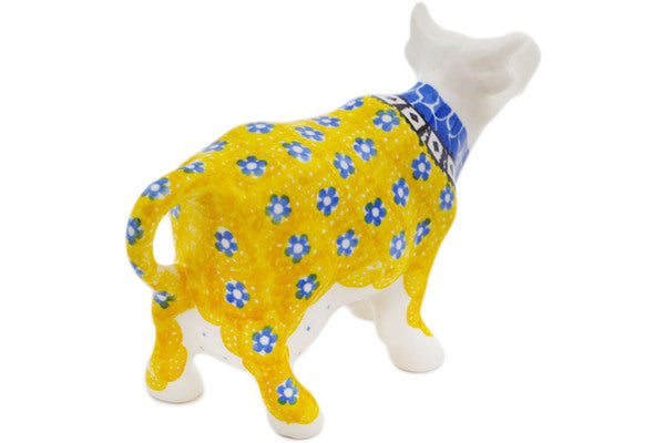 This Sunburst Daisies 6" Cow Figurine was handmade and hand decorated in Boleslawiec, Poland by skilled artisans according to old traditional methods. This Polish stoneware is microwave, dishwasher, freezer, and oven safe up to 480°F. It does not contain lead or cadmium. It is part of the Sunburst Daisies Collection.
