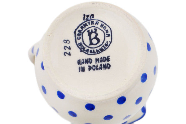 This Blue Polka Dot 12 oz Creamer was handmade and hand decorated in Boleslawiec, Poland by skilled artisans according to old traditional methods. This Polish stoneware is microwave, dishwasher, freezer, and oven safe up to 480°F. It does not contain lead or cadmium. It is part of the Blue Polka Dot Collection.