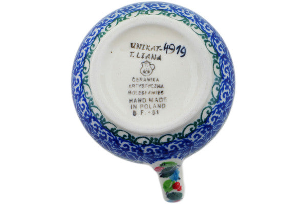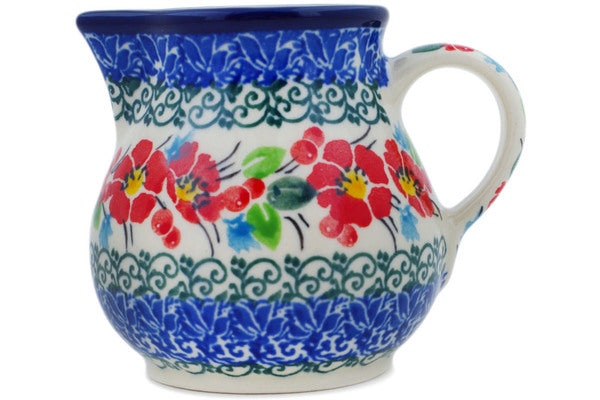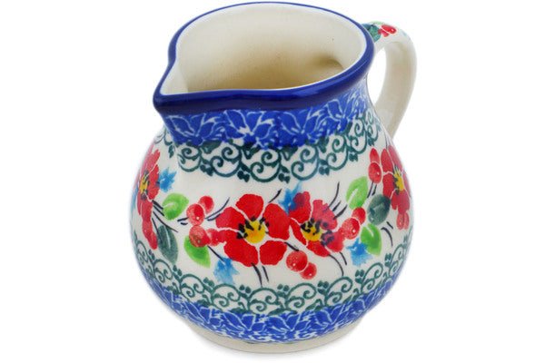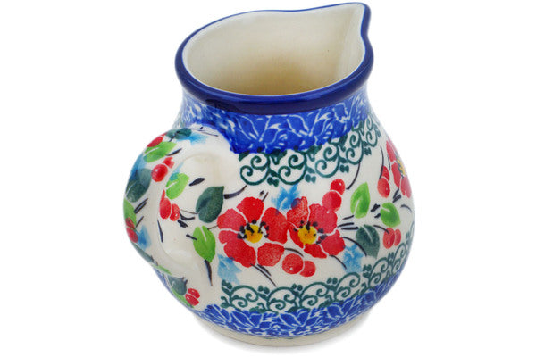 This Cherry Colored Florals 7 oz Creamer was handmade and hand decorated in Boleslawiec, Poland by skilled artisans according to old traditional methods. This is a Polish pottery Signature Unikat, which means that it has been hand painted with both sponges and brushes and it is signed by the artist who painted it. Unikat pieces are the most intricate works of art. Larger Unikat items take hours of very careful work to finish. This Polish stoneware is microwave, dishwasher, freezer, and oven safe up to 480°F. It does not contain lead or cadmium. It is part of the Cherry Colored Florals Collection.