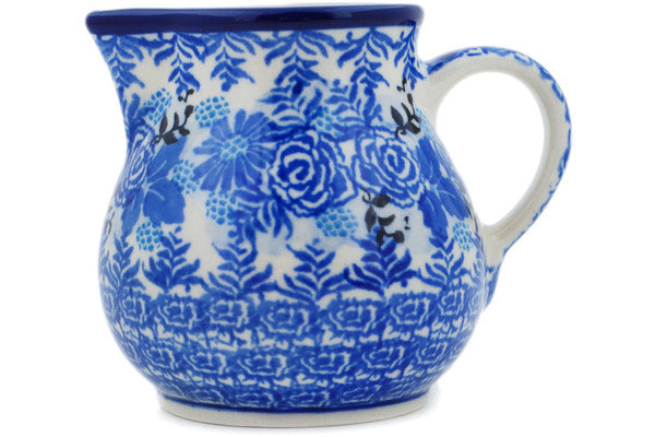 This Frosted Bouquet 7 oz Creamer was handmade and hand decorated in Boleslawiec, Poland by skilled artisans according to old traditional methods. This is a Polish pottery Signature Unikat, which means that it has been hand painted with both sponges and brushes and it is signed by the artist who painted it. Unikat pieces are the most intricate works of art. Larger Unikat items take hours of very careful work to finish. This Polish stoneware is microwave, dishwasher, freezer, and oven safe up to 480°F. It does not contain lead or cadmium. It is part of the Frosted Bouquet Collection.