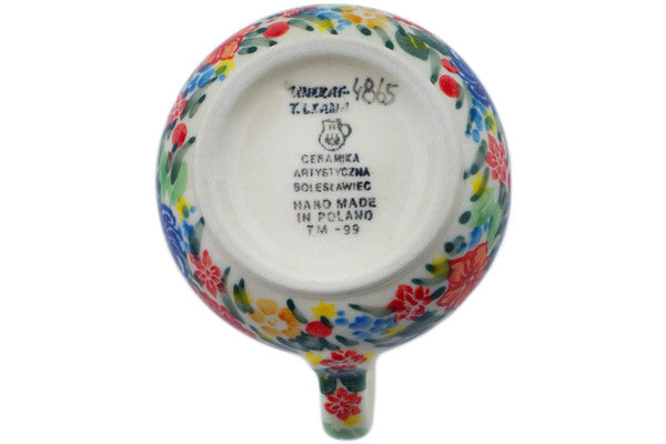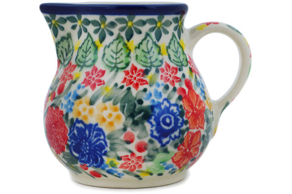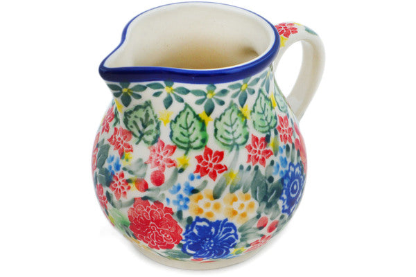 This Red Bouquet 7 oz Creamer was handmade and hand decorated in Boleslawiec, Poland by skilled artisans according to old traditional methods. This is a Polish pottery Signature Unikat, which means that it has been hand painted with both sponges and brushes and it is signed by the artist who painted it. Unikat pieces are the most intricate works of art. Larger Unikat items take hours of very careful work to finish. This Polish stoneware is microwave, dishwasher, freezer, and oven safe up to 480°F. It does not contain lead or cadmium. It is part of the Red Bouquet Collection.