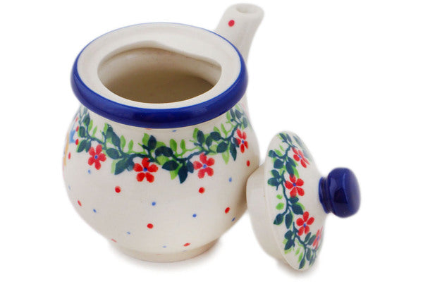 This Princess In A Red Dress 5 oz Creamer with Lid was handmade and hand decorated in Boleslawiec, Poland by skilled artisans according to old traditional methods. This Polish stoneware is microwave, dishwasher, freezer, and oven safe up to 480°F. It does not contain lead or cadmium. It is part of the Princess In A Red Dress Collection.