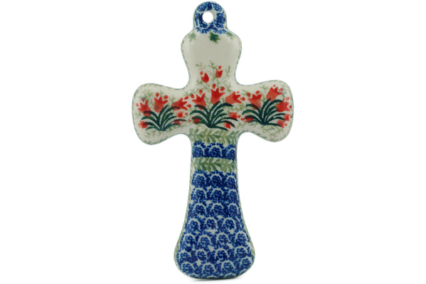 This Crimson Bells 5" Cross was handmade and hand decorated in Boleslawiec, Poland by skilled artisans according to old traditional methods. This Polish stoneware is microwave, dishwasher, freezer, and oven safe up to 480°F. It does not contain lead or cadmium. It is part of the Crimson Bells Collection.