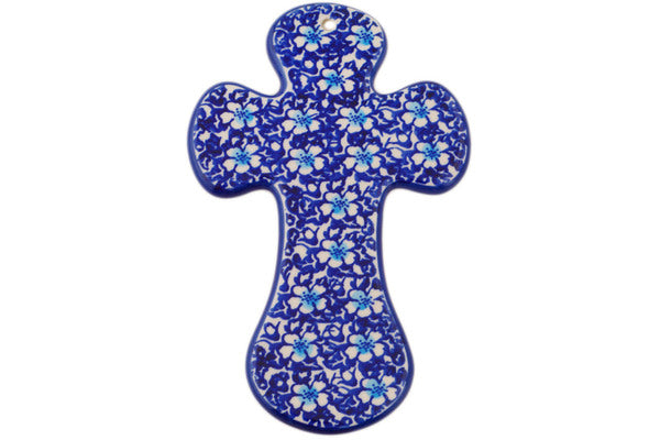 This Flowers On The Lake 7" Cross was handmade and hand decorated in Boleslawiec, Poland by skilled artisans according to old traditional methods. This Polish stoneware is microwave, dishwasher, freezer, and oven safe up to 480°F. It does not contain lead or cadmium. It is part of the Flowers On The Lake Collection.
