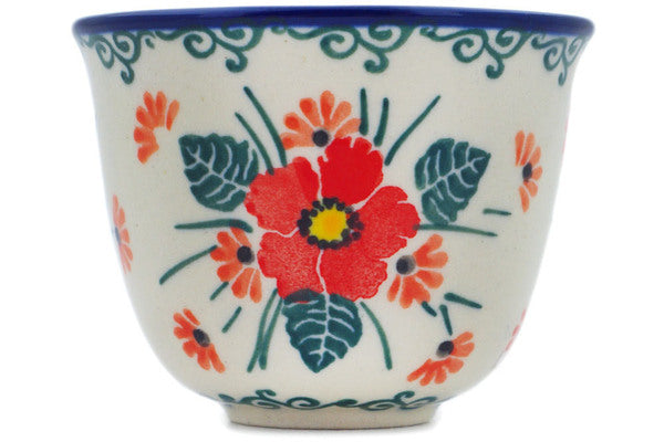 This Pink Forget Me Not 3 oz Cup was handmade and hand decorated in Boleslawiec, Poland by skilled artisans according to old traditional methods. This is a Polish pottery Signature Unikat, which means that it has been hand painted with both sponges and brushes and it is signed by the artist who painted it. Unikat pieces are the most intricate works of art. Larger Unikat items take hours of very careful work to finish. This Polish stoneware is microwave, dishwasher, freezer, and oven safe up to 480°F. It does not contain lead or cadmium. It is part of the Pink Forget Me Not Collection.
