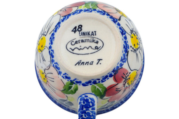 This Maroon Blossoms 8 oz Cup was handmade and hand decorated in Boleslawiec, Poland by skilled artisans according to old traditional methods. This is a Polish pottery Signature Unikat, which means that it has been hand painted with both sponges and brushes and it is signed by the artist who painted it. Unikat pieces are the most intricate works of art. Larger Unikat items take hours of very careful work to finish. This Polish stoneware is microwave, dishwasher, freezer, and oven safe up to 480°F. It does not contain lead or cadmium. It is part of the Maroon Blossoms Collection.