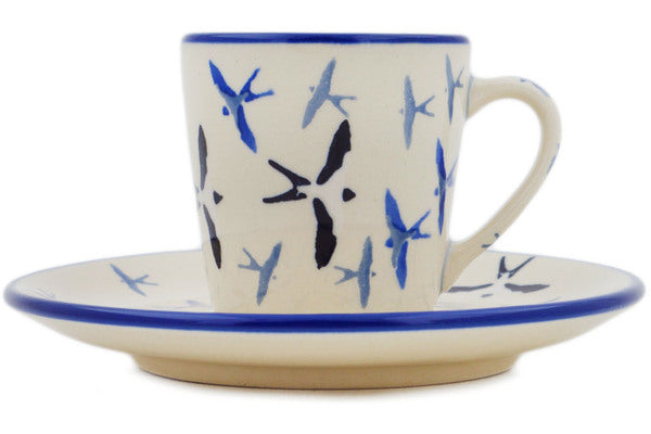 This Soaring Swallows 3 oz Cup with Saucer was handmade and hand decorated in Boleslawiec, Poland by skilled artisans according to old traditional methods. This is a Polish pottery Signature Unikat, which means that it has been hand painted with both sponges and brushes and it is signed by the artist who painted it. Unikat pieces are the most intricate works of art. Larger Unikat items take hours of very careful work to finish. This Polish stoneware is microwave, dishwasher, freezer, and oven safe up to 480°F. It does not contain lead or cadmium. It is part of the Soaring Swallows Collection.