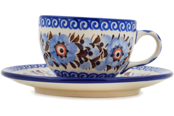 This Brown And Blue Beauty 4 oz Cup with Saucer was handmade and hand decorated in Boleslawiec, Poland by skilled artisans according to old traditional methods. This is a Polish pottery Signature Unikat, which means that it has been hand painted with both sponges and brushes and it is signed by the artist who painted it. Unikat pieces are the most intricate works of art. Larger Unikat items take hours of very careful work to finish. This Polish stoneware is microwave, dishwasher, freezer, and oven safe up to 480°F. It does not contain lead or cadmium. It is part of the Brown And Blue Beauty Collection.