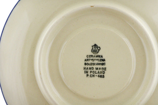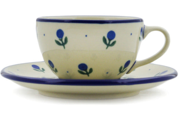 This Blue Buds 7 oz Cup with Saucer was handmade and hand decorated in Boleslawiec, Poland by skilled artisans according to old traditional methods. This Polish stoneware is microwave, dishwasher, freezer, and oven safe up to 480°F. It does not contain lead or cadmium. It is part of the Blue Buds Collection.