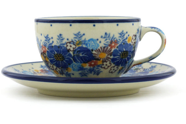 This Flower Wreath 7 oz Cup with Saucer was handmade and hand decorated in Boleslawiec, Poland by skilled artisans according to old traditional methods. This is a Polish pottery Signature Unikat, which means that it has been hand painted with both sponges and brushes and it is signed by the artist who painted it. Unikat pieces are the most intricate works of art. Larger Unikat items take hours of very careful work to finish. This Polish stoneware is microwave, dishwasher, freezer, and oven safe up to 480°F. It does not contain lead or cadmium. It is part of the Flower Wreath Collection.