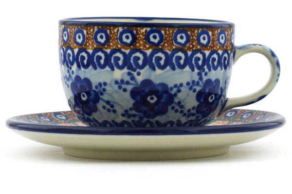 This Dancing Blue Poppies 9 oz Cup with Saucer was handmade and hand decorated in Boleslawiec, Poland by skilled artisans according to old traditional methods. This is a Polish pottery Signature Unikat, which means that it has been hand painted with both sponges and brushes and it is signed by the artist who painted it. Unikat pieces are the most intricate works of art. Larger Unikat items take hours of very careful work to finish. This Polish stoneware is microwave, dishwasher, freezer, and oven safe up to 480°F. It does not contain lead or cadmium. It is part of the Dancing Blue Poppies Collection.