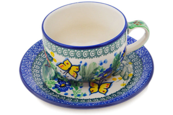 This Spring Garden 9 oz Cup with Saucer was handmade and hand decorated in Boleslawiec, Poland by skilled artisans according to old traditional methods. This is a Polish pottery Signature Unikat, which means that it has been hand painted with both sponges and brushes and it is signed by the artist who painted it. Unikat pieces are the most intricate works of art. Larger Unikat items take hours of very careful work to finish. This Polish stoneware is microwave, dishwasher, freezer, and oven safe up to 480°F. It does not contain lead or cadmium. It is part of the Spring Garden Collection.