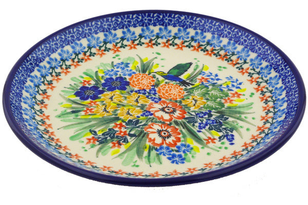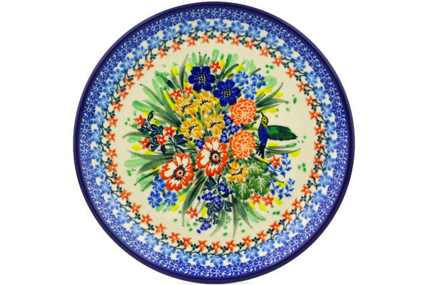 This Hummingbird Meadow 8" Dessert Plate was handmade and hand decorated in Boleslawiec, Poland by skilled artisans according to old traditional methods. This is a Polish pottery Signature Unikat, which means that it has been hand painted with both sponges and brushes and it is signed by the artist who painted it. Unikat pieces are the most intricate works of art. Larger Unikat items take hours of very careful work to finish. This Polish stoneware is microwave, dishwasher, freezer, and oven safe up to 480°F. It does not contain lead or cadmium. It is part of the Hummingbird Meadow Collection.