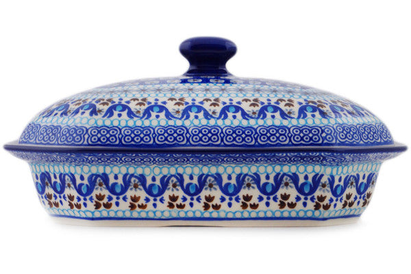 This Blue Ice 10" Dish with Cover was handmade and hand decorated in Boleslawiec, Poland by skilled artisans according to old traditional methods. This Polish stoneware is microwave, dishwasher, freezer, and oven safe up to 480°F. It does not contain lead or cadmium. It is part of the Blue Ice Collection.