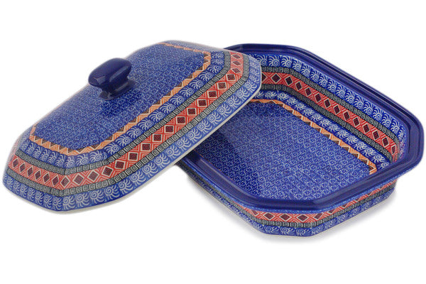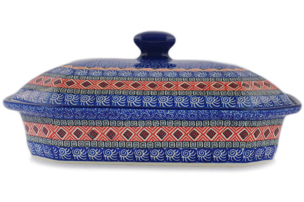This Aztec Night 12" Dish with Cover was handmade and hand decorated in Boleslawiec, Poland by skilled artisans according to old traditional methods. This Polish stoneware is microwave, dishwasher, freezer, and oven safe up to 480°F. It does not contain lead or cadmium. It is part of the Aztec Night Collection.