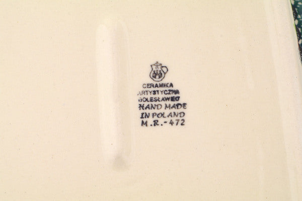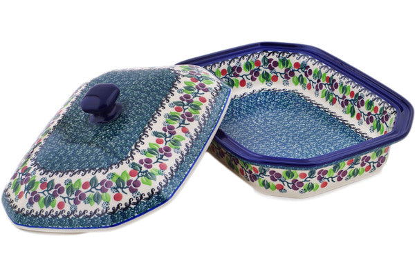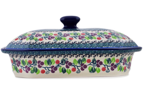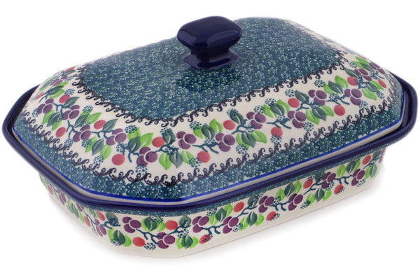 This Berry Garland 12" Dish with Cover was handmade and hand decorated in Boleslawiec, Poland by skilled artisans according to old traditional methods. This Polish stoneware is microwave, dishwasher, freezer, and oven safe up to 480°F. It does not contain lead or cadmium. It is part of the Berry Garland Collection.
