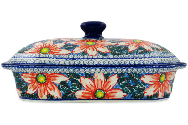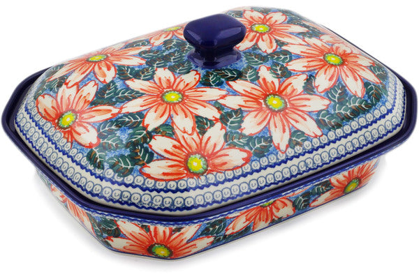 This Bold Susan 12" Dish with Cover was handmade and hand decorated in Boleslawiec, Poland by skilled artisans according to old traditional methods. This is a Polish pottery Signature Unikat, which means that it has been hand painted with both sponges and brushes and it is signed by the artist who painted it. Unikat pieces are the most intricate works of art. Larger Unikat items take hours of very careful work to finish. This Polish stoneware is microwave, dishwasher, freezer, and oven safe up to 480°F. It does not contain lead or cadmium. It is part of the Bold Susan Collection.