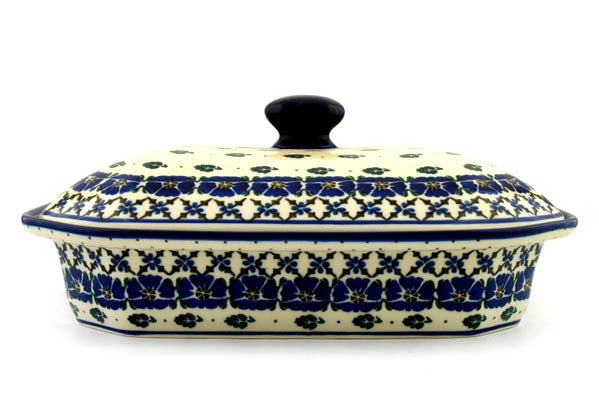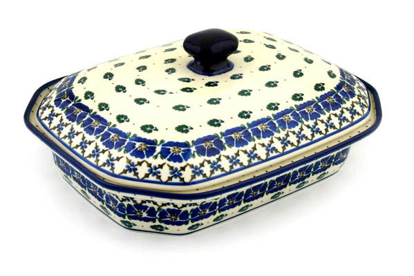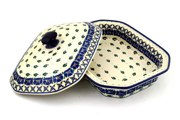 This Royal Poppy Circle 12" Dish with Cover was handmade and hand decorated in Boleslawiec, Poland by skilled artisans according to old traditional methods. This Polish stoneware is microwave, dishwasher, freezer, and oven safe up to 480°F. It does not contain lead or cadmium. It is part of the Royal Poppy Circle Collection.