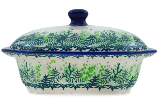 This Fresh Fern 7" Dish with Cover was handmade and hand decorated in Boleslawiec, Poland by skilled artisans according to old traditional methods. This is a Polish pottery Signature Unikat, which means that it has been hand painted with both sponges and brushes and it is signed by the artist who painted it. Unikat pieces are the most intricate works of art. Larger Unikat items take hours of very careful work to finish. This Polish stoneware is microwave, dishwasher, freezer, and oven safe up to 480°F. It does not contain lead or cadmium. It is part of the Fresh Fern Collection.