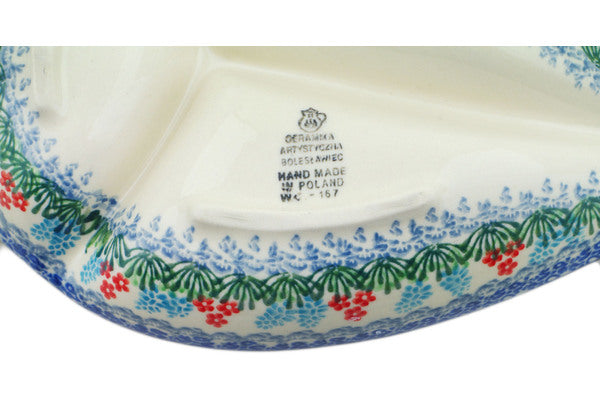 This Great Day 10" Divided Dish was handmade and hand decorated in Boleslawiec, Poland by skilled artisans according to old traditional methods. This Polish stoneware is microwave, dishwasher, freezer, and oven safe up to 480°F. It does not contain lead or cadmium. It is part of the Great Day Collection.