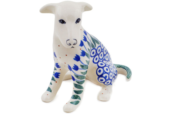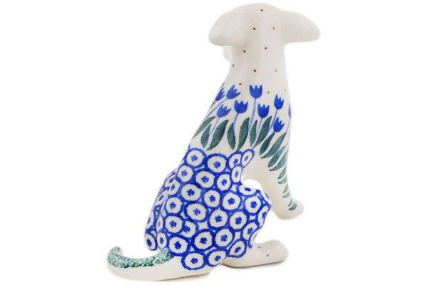This Water Tulip 4" Dog Figurine was handmade and hand decorated in Boleslawiec, Poland by skilled artisans according to old traditional methods. This Polish stoneware is microwave, dishwasher, freezer, and oven safe up to 480°F. It does not contain lead or cadmium. It is part of the Water Tulip Collection.