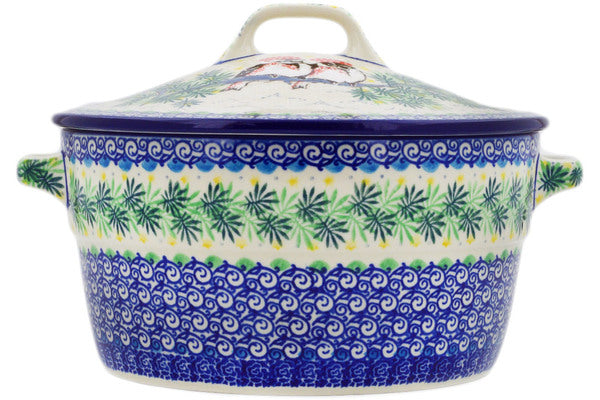 This Cozy Bullfinch 8-inch Dutch Oven was handmade and hand decorated in Boleslawiec, Poland by skilled artisans according to old traditional methods. This is a Polish pottery Signature Unikat, which means that it has been hand painted with both sponges and brushes and it is signed by the artist who painted it. Unikat pieces are the most intricate works of art. Larger Unikat items take hours of very careful work to finish. This Polish stoneware is microwave, dishwasher, freezer, and oven safe up to 480°F. It does not contain lead or cadmium. It is part of the Cozy Bullfinch Collection.