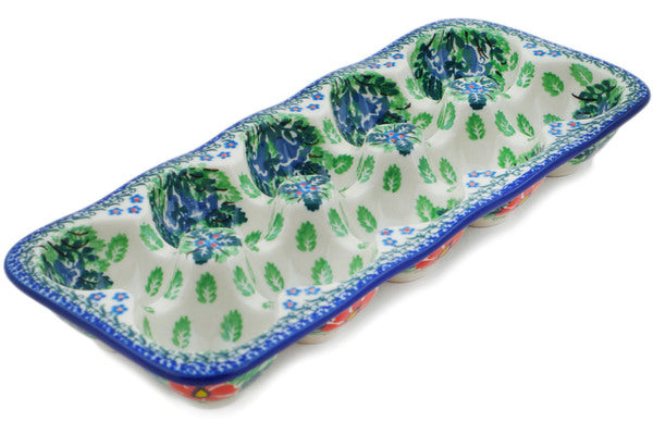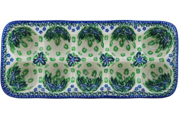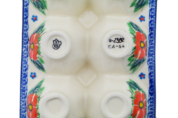 This Angel Path 11" Egg Crate was handmade and hand decorated in Boleslawiec, Poland by skilled artisans according to old traditional methods. This is a Polish pottery Signature Unikat, which means that it has been hand painted with both sponges and brushes and it is signed by the artist who painted it. Unikat pieces are the most intricate works of art. Larger Unikat items take hours of very careful work to finish. This Polish stoneware is microwave, dishwasher, freezer, and oven safe up to 480°F. It does not contain lead or cadmium. It is part of the Angel Path Collection.