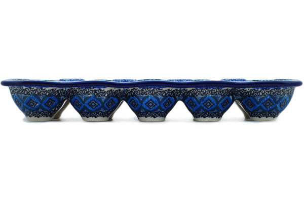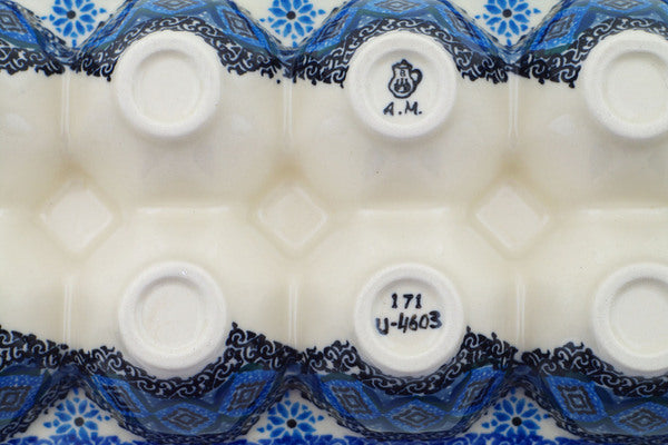 This Blue Kaleidoscope 11" Egg Crate was handmade and hand decorated in Boleslawiec, Poland by skilled artisans according to old traditional methods. This is a Polish pottery Signature Unikat, which means that it has been hand painted with both sponges and brushes and it is signed by the artist who painted it. Unikat pieces are the most intricate works of art. Larger Unikat items take hours of very careful work to finish. This Polish stoneware is microwave, dishwasher, freezer, and oven safe up to 480°F. It does not contain lead or cadmium. It is part of the Blue Kaleidoscope Collection.