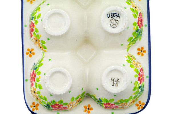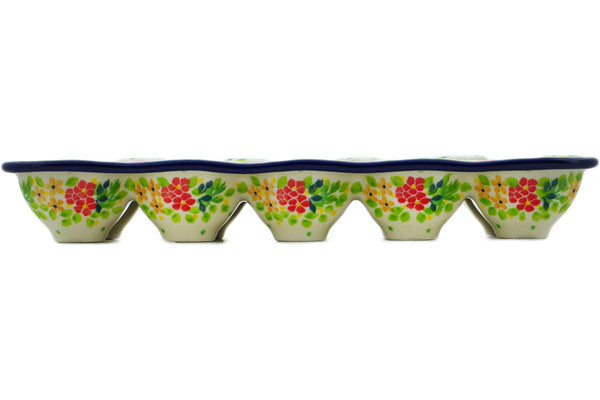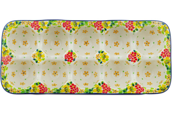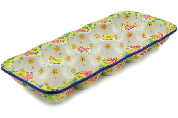 This Bright Spring 11" Egg Crate was handmade and hand decorated in Boleslawiec, Poland by skilled artisans according to old traditional methods. This is a Polish pottery Signature Unikat, which means that it has been hand painted with both sponges and brushes and it is signed by the artist who painted it. Unikat pieces are the most intricate works of art. Larger Unikat items take hours of very careful work to finish. This Polish stoneware is microwave, dishwasher, freezer, and oven safe up to 480°F. It does not contain lead or cadmium. It is part of the Bright Spring Collection.
