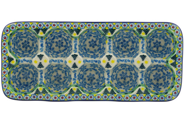 This Christmas Forest 11" Egg Crate was handmade and hand decorated in Boleslawiec, Poland by skilled artisans according to old traditional methods. This is a Polish pottery Signature Unikat, which means that it has been hand painted with both sponges and brushes and it is signed by the artist who painted it. Unikat pieces are the most intricate works of art. Larger Unikat items take hours of very careful work to finish. This Polish stoneware is microwave, dishwasher, freezer, and oven safe up to 480°F. It does not contain lead or cadmium. It is part of the Christmas Forest Collection.