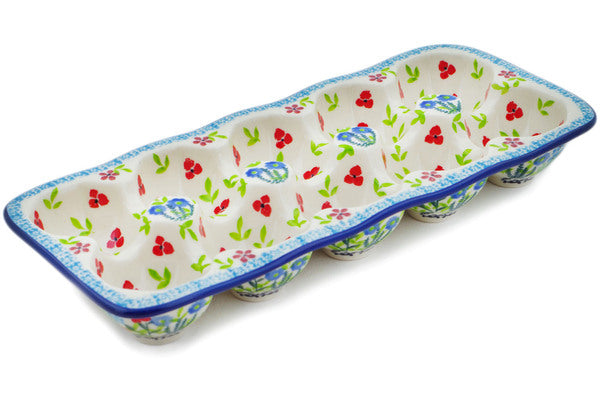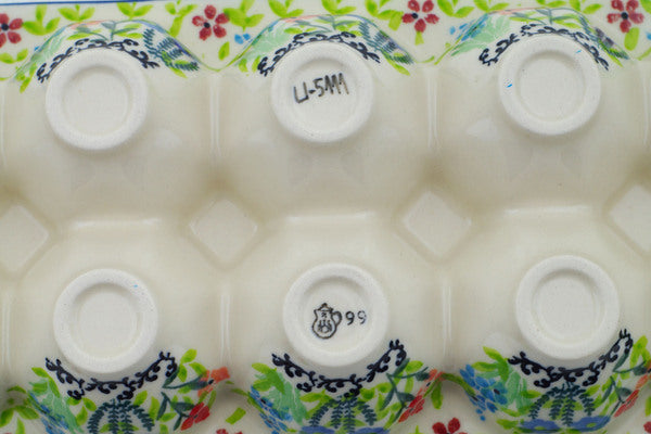 This Spring Essence 11" Egg Crate was handmade and hand decorated in Boleslawiec, Poland by skilled artisans according to old traditional methods. This is a Polish pottery Signature Unikat, which means that it has been hand painted with both sponges and brushes and it is signed by the artist who painted it. Unikat pieces are the most intricate works of art. Larger Unikat items take hours of very careful work to finish. This Polish stoneware is microwave, dishwasher, freezer, and oven safe up to 480°F. It does not contain lead or cadmium. It is part of the Spring Essence Collection.