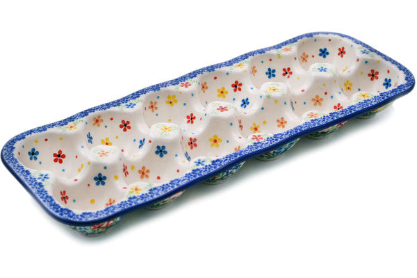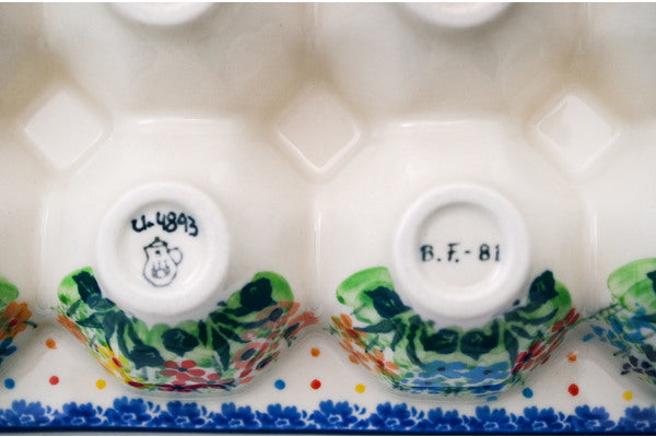 This Colors Of The Wind 13" Egg Crate was handmade and hand decorated in Boleslawiec, Poland by skilled artisans according to old traditional methods. This is a Polish pottery Signature Unikat, which means that it has been hand painted with both sponges and brushes and it is signed by the artist who painted it. Unikat pieces are the most intricate works of art. Larger Unikat items take hours of very careful work to finish. This Polish stoneware is microwave, dishwasher, freezer, and oven safe up to 480°F. It does not contain lead or cadmium. It is part of the Colors Of The Wind Collection.