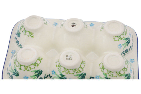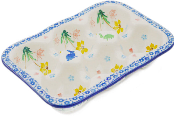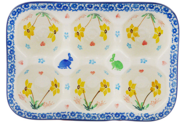 This Hopping In Love 7" Egg Crate was handmade and hand decorated in Boleslawiec, Poland by skilled artisans according to old traditional methods. This Polish stoneware is microwave, dishwasher, freezer, and oven safe up to 480°F. It does not contain lead or cadmium. It is part of the Hopping In Love Collection.