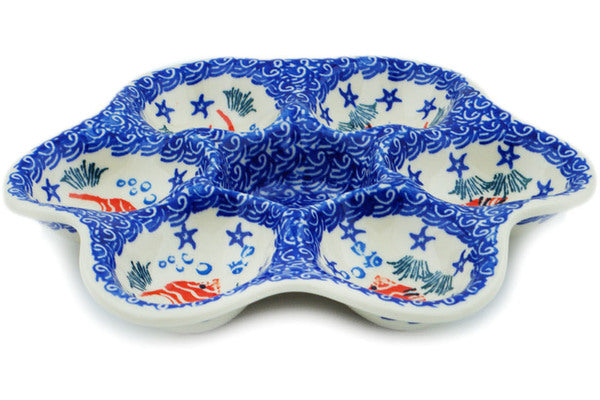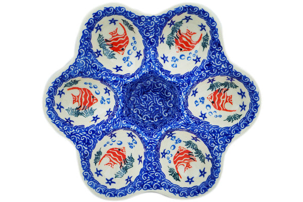 This Angel Fish 8" Egg Plate was handmade and hand decorated in Boleslawiec, Poland by skilled artisans according to old traditional methods. This Polish stoneware is microwave, dishwasher, freezer, and oven safe up to 480°F. It does not contain lead or cadmium. It is part of the Angel Fish Collection.