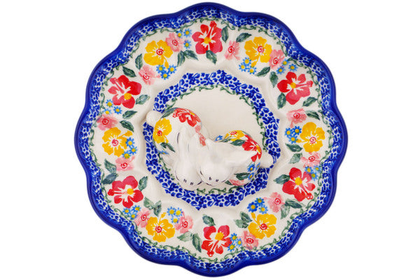 This Hibiscus Haven 8" Egg Plate was handmade and hand decorated in Boleslawiec, Poland by skilled artisans according to old traditional methods. This Polish stoneware is microwave, dishwasher, freezer, and oven safe up to 480°F. It does not contain lead or cadmium. It is part of the Hibiscus Haven Collection.
