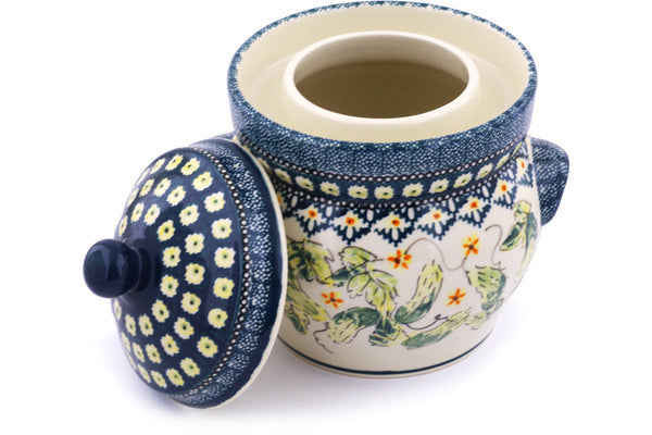 This Cucumber Patch 8" Fermenting crock pot was handmade and hand decorated in Boleslawiec, Poland by skilled artisans according to old traditional methods. This Polish stoneware is microwave, dishwasher, freezer, and oven safe up to 480°F. It does not contain lead or cadmium. It is part of the Cucumber Patch Collection.