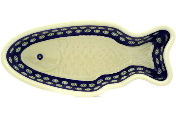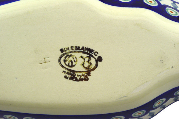 This Peacock Leaves 14" Fish Shaped Platter was handmade and hand decorated in Boleslawiec, Poland by skilled artisans according to old traditional methods. This Polish stoneware is microwave, dishwasher, freezer, and oven safe up to 480°F. It does not contain lead or cadmium. It is part of the Peacock Leaves Collection.