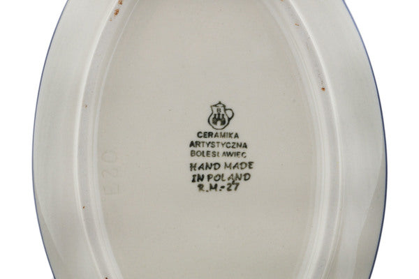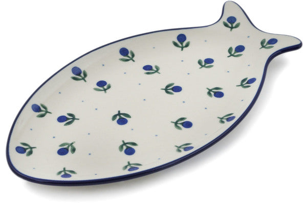 This Blue Buds 9" Fish Shaped Platter was handmade and hand decorated in Boleslawiec, Poland by skilled artisans according to old traditional methods. This Polish stoneware is microwave, dishwasher, freezer, and oven safe up to 480°F. It does not contain lead or cadmium. It is part of the Blue Buds Collection.