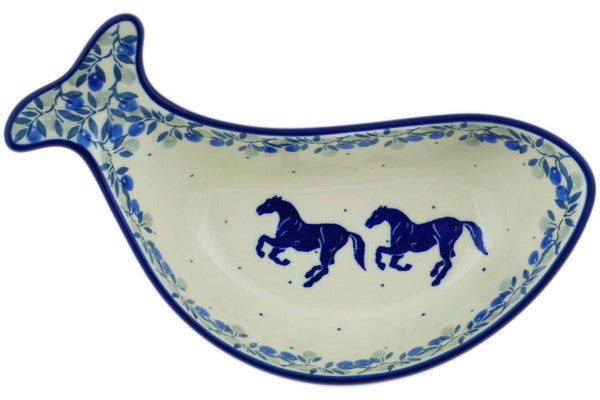 This Horse Gallop 9" Fish Shaped Platter was handmade and hand decorated in Boleslawiec, Poland by skilled artisans according to old traditional methods. This Polish stoneware is microwave, dishwasher, freezer, and oven safe up to 480°F. It does not contain lead or cadmium. It is part of the Horse Gallop Collection.