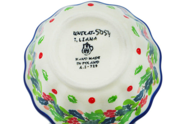 This Christmas Flower 4" Fluted Bowl was handmade and hand decorated in Boleslawiec, Poland by skilled artisans according to old traditional methods. This is a Polish pottery Signature Unikat, which means that it has been hand painted with both sponges and brushes and it is signed by the artist who painted it. Unikat pieces are the most intricate works of art. Larger Unikat items take hours of very careful work to finish. This Polish stoneware is microwave, dishwasher, freezer, and oven safe up to 480°F. It does not contain lead or cadmium. It is part of the Christmas Flower Collection.