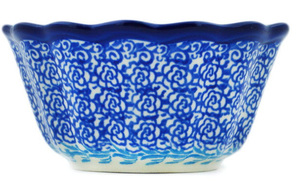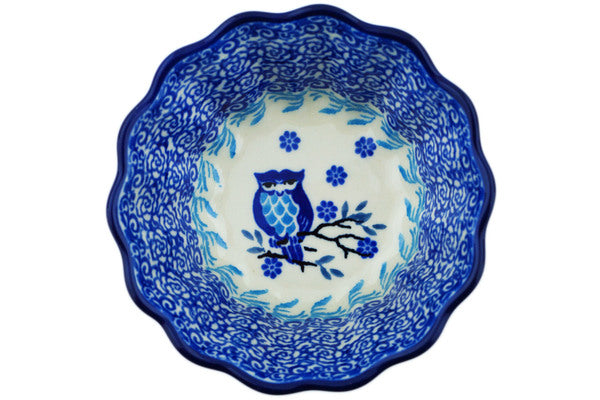 This Owl Kingdom 4" Fluted Bowl was handmade and hand decorated in Boleslawiec, Poland by skilled artisans according to old traditional methods. This is a Polish pottery Signature Unikat, which means that it has been hand painted with both sponges and brushes and it is signed by the artist who painted it. Unikat pieces are the most intricate works of art. Larger Unikat items take hours of very careful work to finish. This Polish stoneware is microwave, dishwasher, freezer, and oven safe up to 480°F. It does not contain lead or cadmium. It is part of the Owl Kingdom Collection.