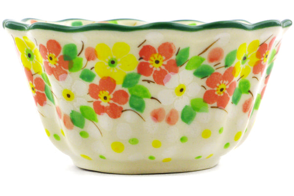 This Blossom Sprinkle 4" Fluted Bowl was handmade and hand decorated in Boleslawiec, Poland by skilled artisans according to old traditional methods. This is a Polish pottery Signature Unikat, which means that it has been hand painted with both sponges and brushes and it is signed by the artist who painted it. Unikat pieces are the most intricate works of art. Larger Unikat items take hours of very careful work to finish. This Polish stoneware is microwave, dishwasher, freezer, and oven safe up to 480°F. It does not contain lead or cadmium. It is part of the Blossom Sprinkle Collection.