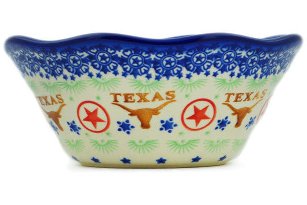 This Texas State 7" Scalloped Fluted Bowl was handmade and hand decorated in Boleslawiec, Poland by skilled artisans according to old traditional methods. This Polish stoneware is microwave, dishwasher, freezer, and oven safe up to 480°F. It does not contain lead or cadmium. It is part of the Texas State Collection.