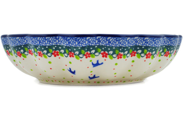 This Bird Prince And Princess 9" Fluted Bowl was handmade and hand decorated in Boleslawiec, Poland by skilled artisans according to old traditional methods. This is a Polish pottery Signature Unikat, which means that it has been hand painted with both sponges and brushes and it is signed by the artist who painted it. Unikat pieces are the most intricate works of art. Larger Unikat items take hours of very careful work to finish. This Polish stoneware is microwave, dishwasher, freezer, and oven safe up to 480°F. It does not contain lead or cadmium. It is part of the Bird Prince And Princess Collection.