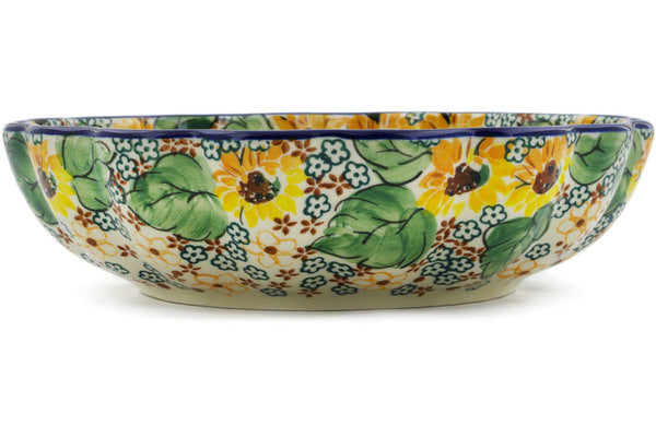 This Country Sunflower 9" Fluted Bowl was handmade and hand decorated in Boleslawiec, Poland by skilled artisans according to old traditional methods. This is a Polish pottery Signature Unikat, which means that it has been hand painted with both sponges and brushes and it is signed by the artist who painted it. Unikat pieces are the most intricate works of art. Larger Unikat items take hours of very careful work to finish. This Polish stoneware is microwave, dishwasher, freezer, and oven safe up to 480°F. It does not contain lead or cadmium. It is part of the Country Sunflower Collection.