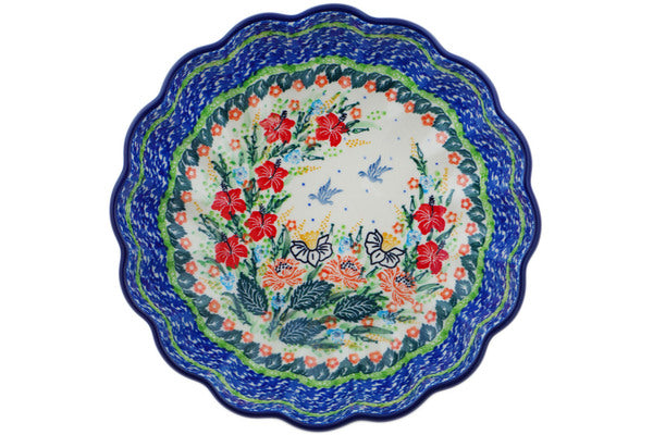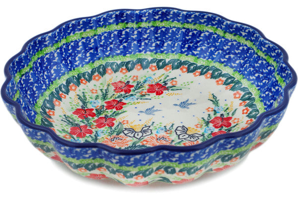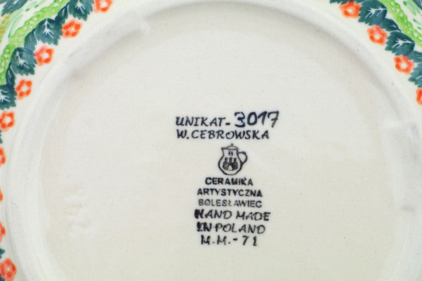 This Dove Escape 9" Fluted Bowl was handmade and hand decorated in Boleslawiec, Poland by skilled artisans according to old traditional methods. This is a Polish pottery Signature Unikat, which means that it has been hand painted with both sponges and brushes and it is signed by the artist who painted it. Unikat pieces are the most intricate works of art. Larger Unikat items take hours of very careful work to finish. This Polish stoneware is microwave, dishwasher, freezer, and oven safe up to 480°F. It does not contain lead or cadmium. It is part of the Dove Escape Collection.